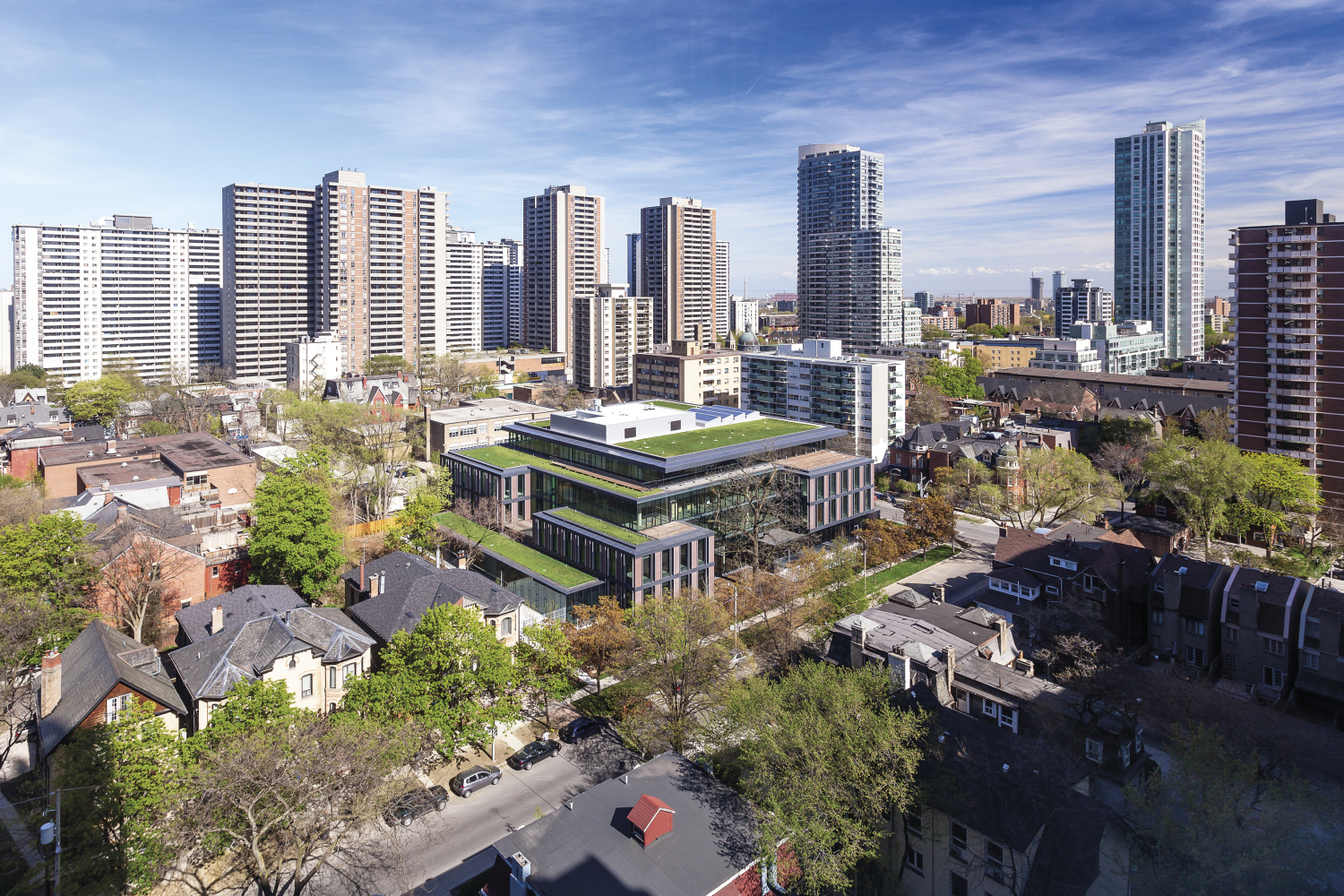 The building is located in the Upper Jarvis Neighbourhood, a small yet diverse enclave of Victorian residences, offices and condominium towers, rental apartments and the AIDS hospice, Casey House. While the design was first driven by the goal to provide the healthiest work environment, considerable attention was placed on ensuring the overall massing would respond to the rhythm and scale of the surrounding context. A series of terraced roofs maximize access to daylight, views, fresh air and access to the outdoors at every level, while also strategically preserving a majestic Black Walnut tree.